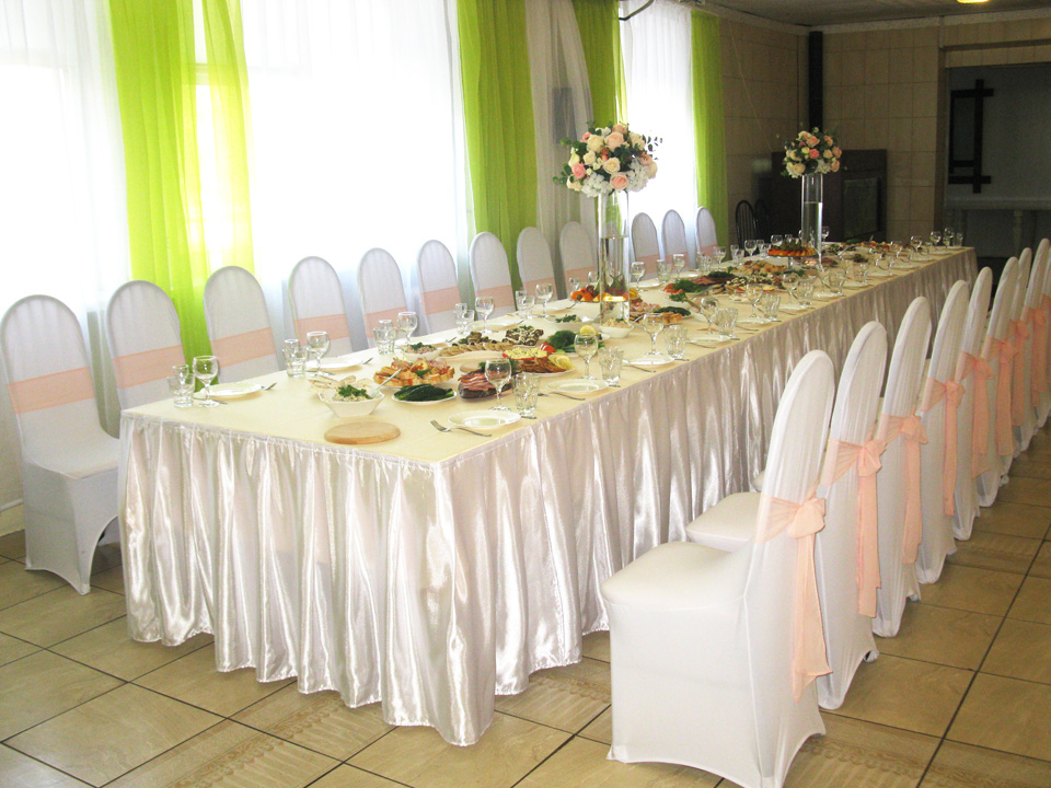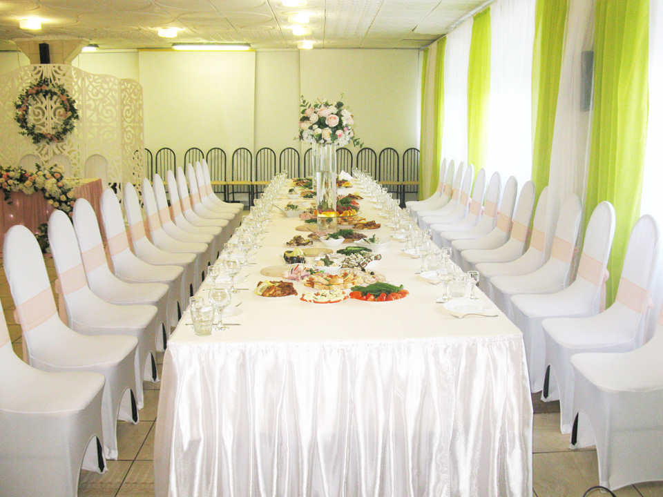 Приятный бонус - при заказе банкета предоставим чехлы на стулья и скатерти, а для встречи гостей - стол для аперитива с фонтаном для напитков и горкой для фруктов.